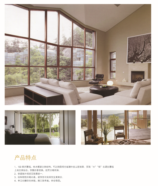 純木框架主體結構,可達到隐框全玻璃外視立面效果,實現“木”“鋁”在建築幕牆上的完美結合;是建築外觀視覺效果統一;結構特性外鋼内柔,裝飾性與實用性完美結合;單元模塊化安裝,施工效率高,安全穩固;獨特的系統設計,可實現在陽光房内側安裝玻璃,解決了在高層安裝時不安全、不方便的問題。