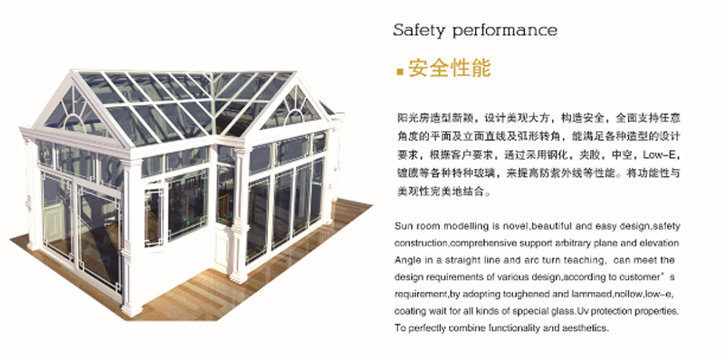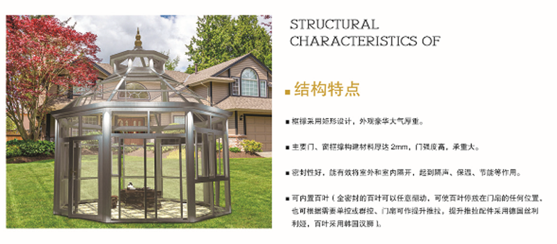 源自歐洲經典的構件式鋁包木陽光房系統;作爲更具品質的陽光房,其室外側采用優質的鋁合金材質,室内側采用優質的實木;高性能防水、安全和節能技術;拓展空間,自由享受室外陽光和景色;獨特的系統設計,可實現在陽光房内側安裝玻璃,解決了在高層安裝時不安全、不方便的問題。